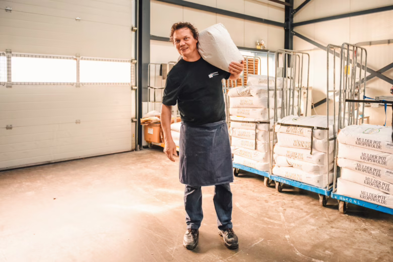 Luuk weet wat er in zijn meel zit. Geen meelverbeteraars of additieven, maar de hele korrel, inclusief het vliesje. ‘Dat geeft het brood smaak, zachtheid en karakter’, vult Luuk aan. Hij werkt met drie soorten meel van Mulder Pot: half patent, volkoren en spelt. ‘Als ik zeg volkoren, dan bedoel ik ook 100% volkoren. Geen mix van witmeel met wat kleurstof, zoals in veel supermarktbrood.’